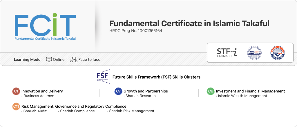 FCIT is designed to ensure that industry practitioners attain the required foundation knowledge in Shariah, Islamic Takaful. Learners will be equipped with the fundamentals and the applied contracts of Shariah in Islamic finance, as well as the foundation of Islamic Takaful with an overview of its products and operations.